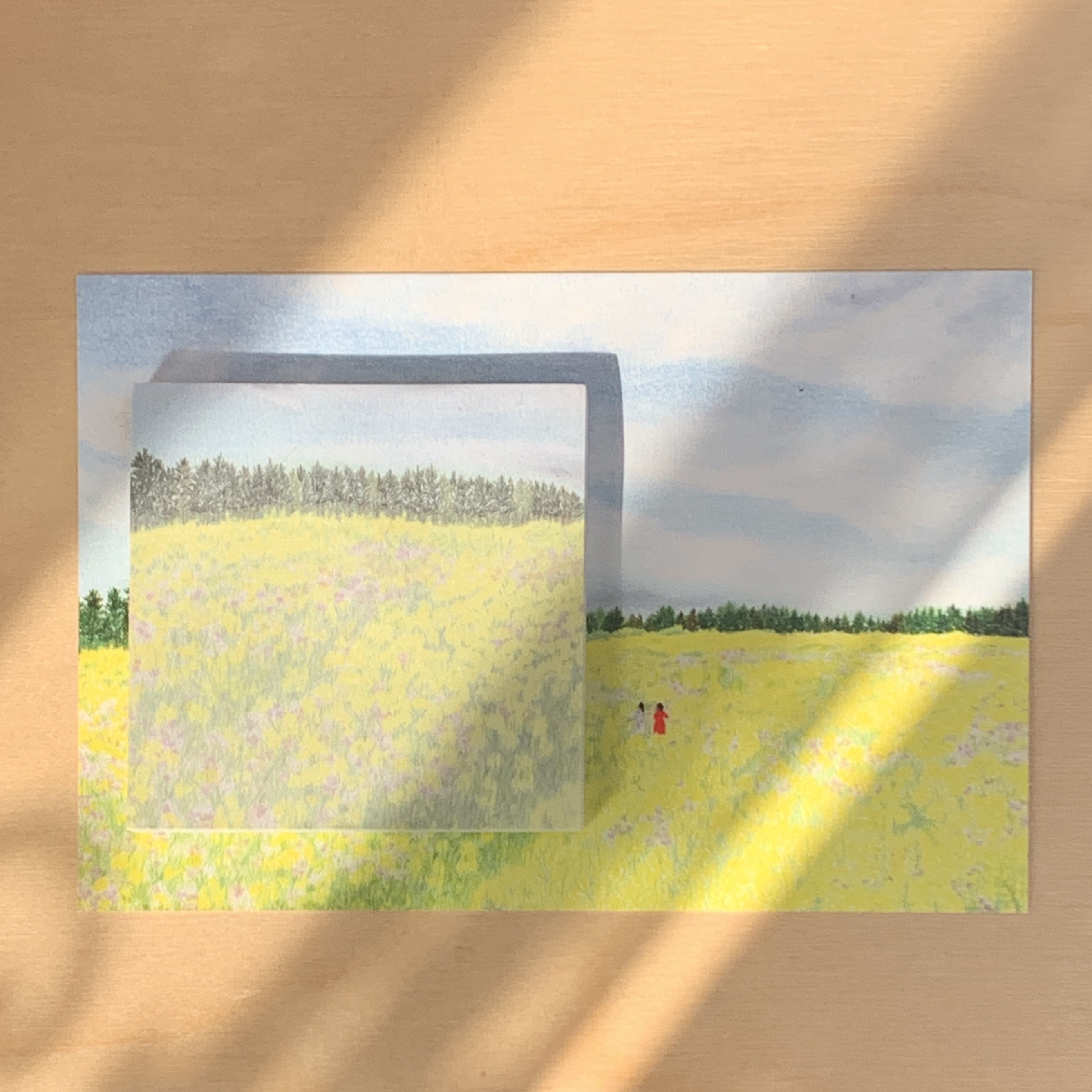 봄날의 노오랗고 보라빛의 유채꽃밭을 담은