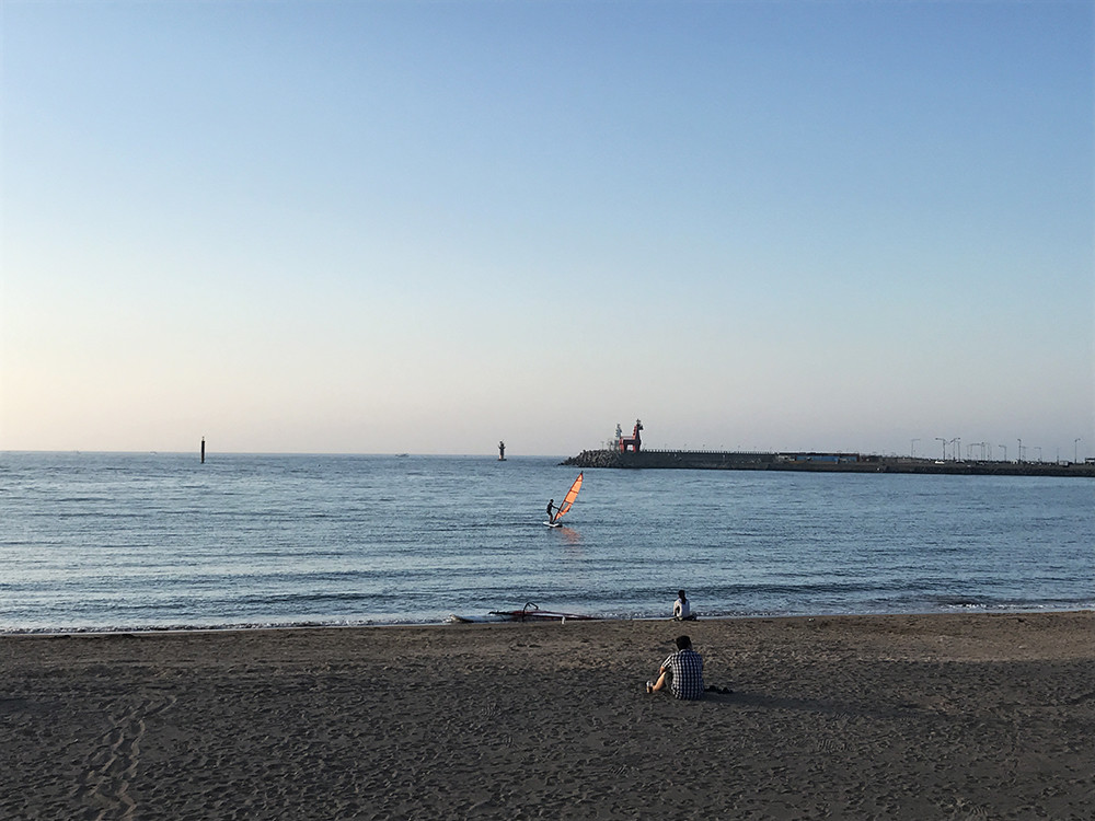해가 저물어가기 시작할 즈음 윈드서핑을 하는 사람들과