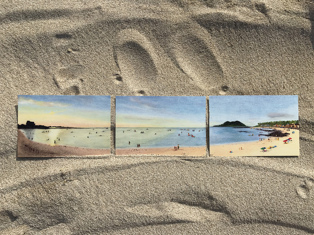 세 장이 하나로 이어지는 엽서 세트입니다.